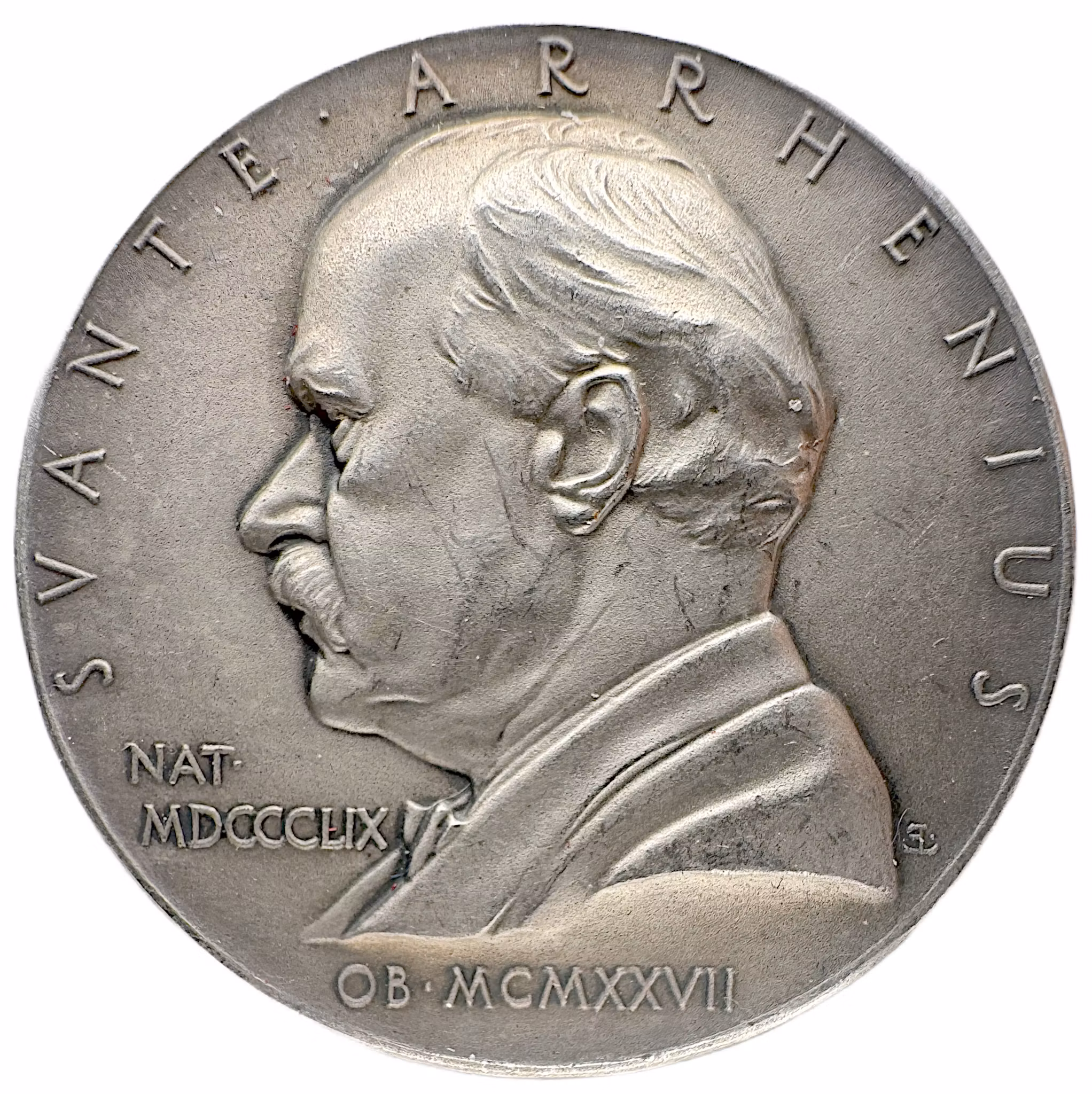 Vänstervänd bröstbild av professorn och nobelpristagaren Svante Arrhenius. Porträttet är kraftfullt modellerat och framhäver hans distinkta anletsdrag, med ett fylligt, något bakåtkammat hår och ett stort, vågigt skägg. Nedanför bröstbilden återfinns gravören Erik Lindbergs signatur "E·L·". Längs medaljens ytterkant löper omskriften: "SVANTE· ARRHENIUS· CHEM· PROF· HOLM· N· MDCCCLIX· OB· MCMXXVII". Det latinska originalets förkortningar utläses Svante Arrhenius Chemiae Professor Holmiensis. Natus 1859 Obiit 1927. På svenska översätts detta till: Svante Arrhenius, professor i kemi i Stockholm, född 1859, död 1927.