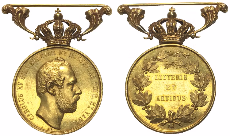 Extremt sällsynt belöningsmedalj utdelad till personer som utmärk sig specielt för insatser inom vetenskap och konst. Under Karl XV:s regeringstid utdelades endast 27 medaljer av vilka endast några få överlevt till våra dagar. Möjligen är detta exemplar unikt. Ett tillfälle för samlaren av guldrariteter! Kvalitet 1+/01, 23 karat guld 30.80 gram, 32mm. Hildebrand 52. Graverad av Lea Ahlborn.