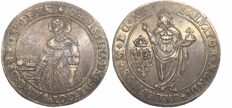 Ett ovanligt välbevarat och skarpt exemplar av Kristinas vackra Salariksdaler. Vacker patina. Kvalitet 1+/01+, SM 11