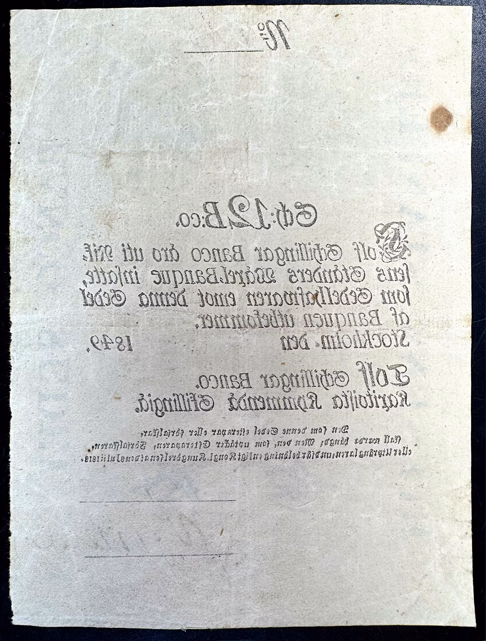 Sveriges Riksbank - 12 Skilling Banco 1849 - Tilltalande exemplar 0 kr 2 950 kr Sveriges Riksbank - 12 Skilling Banco 1849 - Tilltalande exemplarKvalitet 1+/01, liten fläck, DSS 378 (Delzanno Sveriges sedlar), Nr 12494