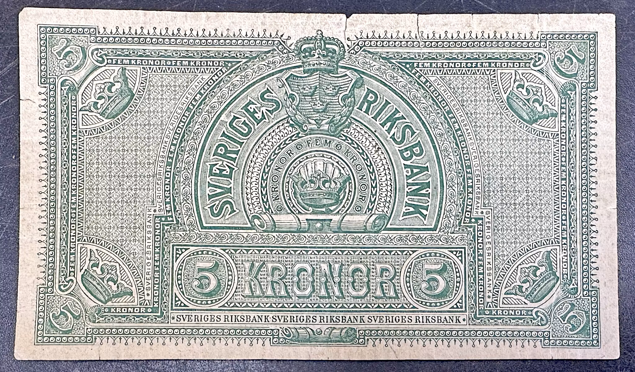 En sällsynt sedel, med endast ett lätt mittveck, nätt och jämt skönjbart. Dessvärre har någon varit lite ovarsam och gett sedeln fyra små riss i överkant och ett i vänsterkant. Fräscht papper med fint ljud (när man slår i pappret) inget solkigt trött ljud. Kvalitet 1+/01+, Litt. P, Nr. 10276. DSS 1048 (Delzanno Sveriges sedlar 2025)