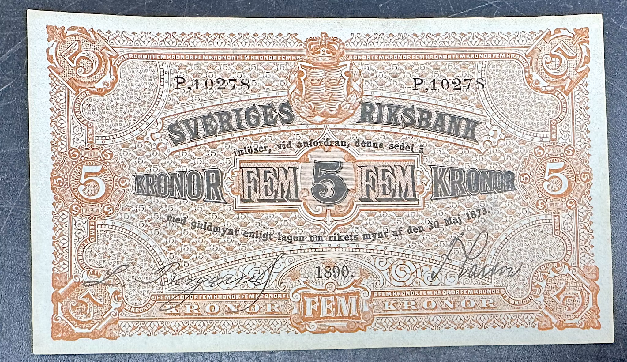 Sveriges Riksbank Sedel - 5 Kronor 1890 - Ovikt toppexemplar - Mycket sällsynt
