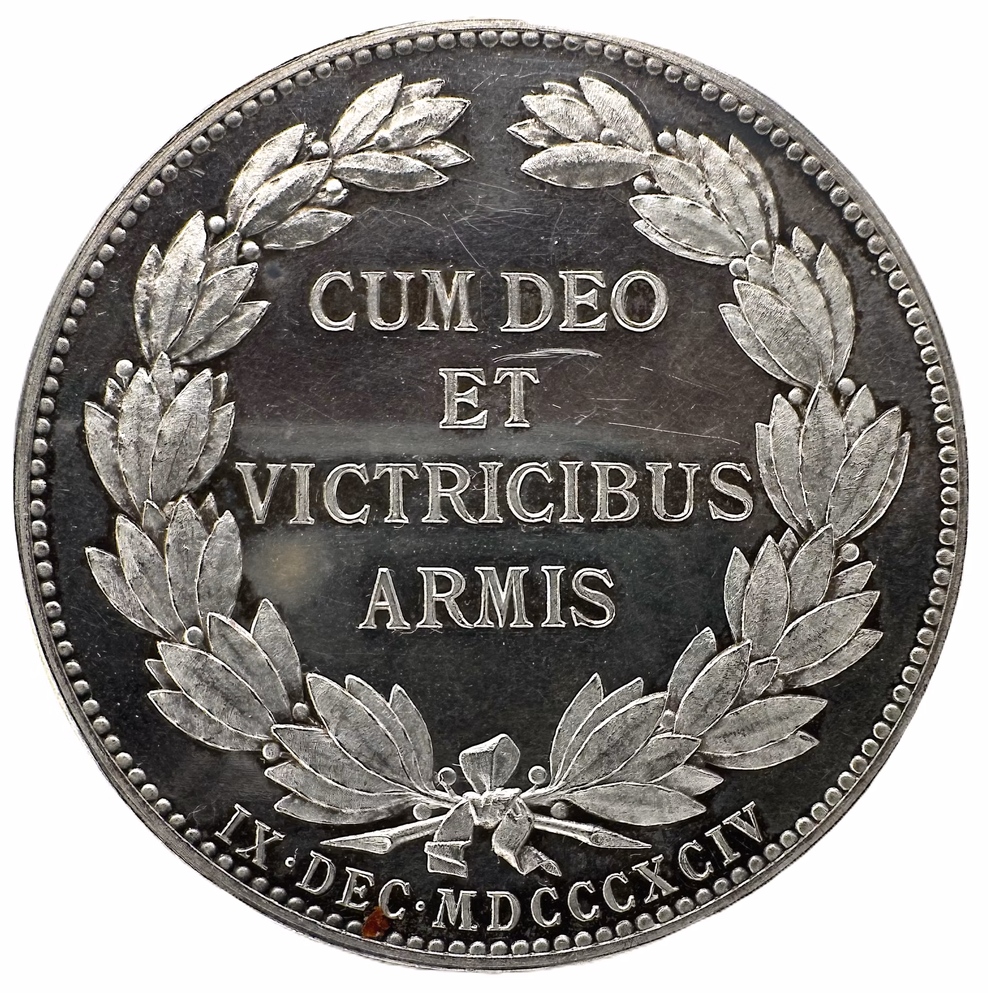 Valspråk inom lagerkrans: "CUM DEO / ET / VICTRICIBUS / ARMIS". Under kransen: "IX•DEC•MDCCCXCIV"