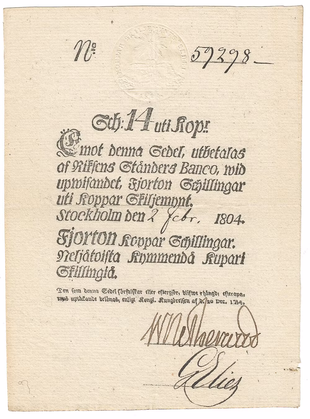 Vita banksedlar - 14 Kopparskillngar 1804 0 kr 3 250 kr Vita banksedlar - 14 Kopparskillngar 1804Kvalitet 1+/01, DSS 189, SS 3, Nr 59298