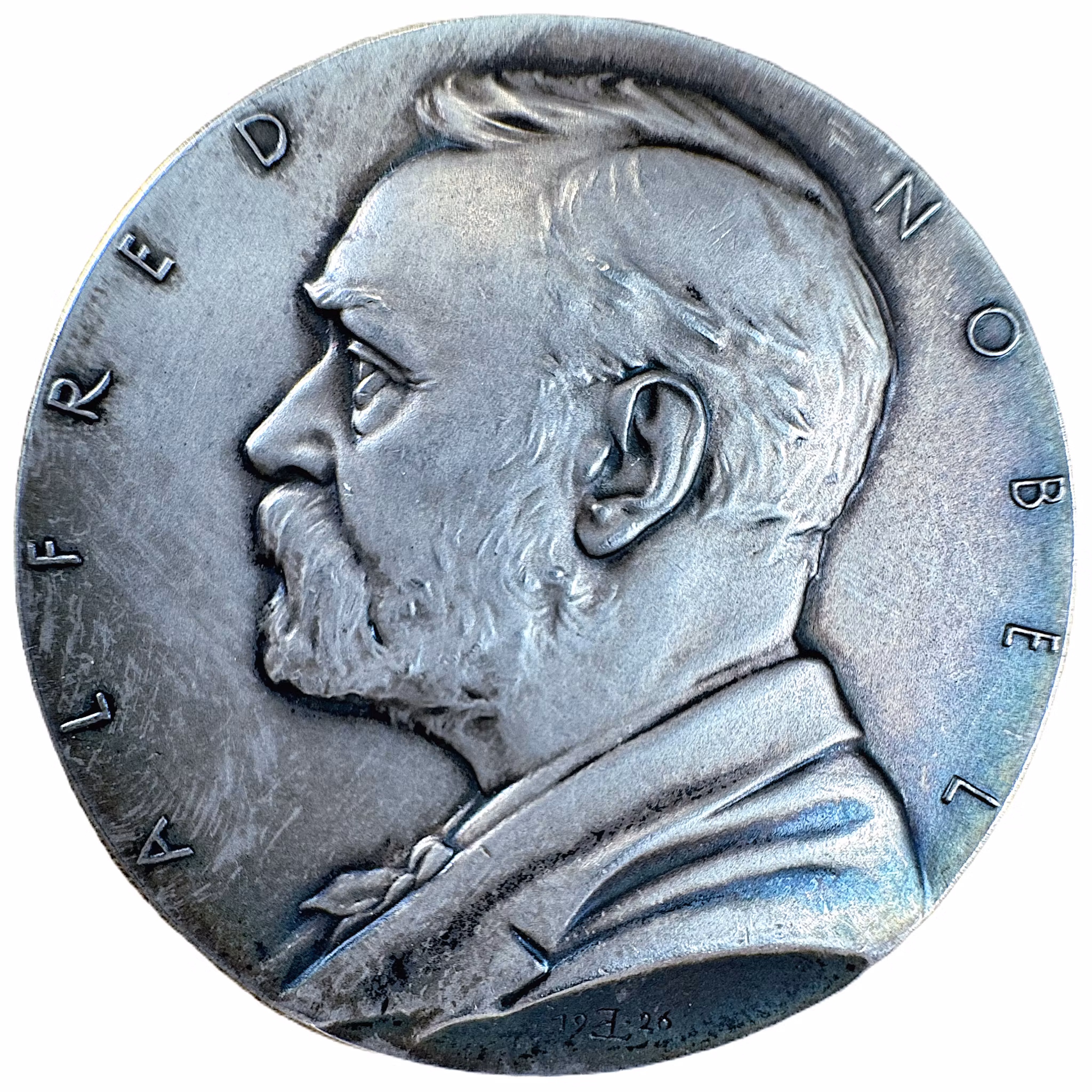 Alfred Nobels vänstervända bröstbild, under bilden gravörens monogram och årtal 1926. I omskriften: "ALFRED NOBEL"