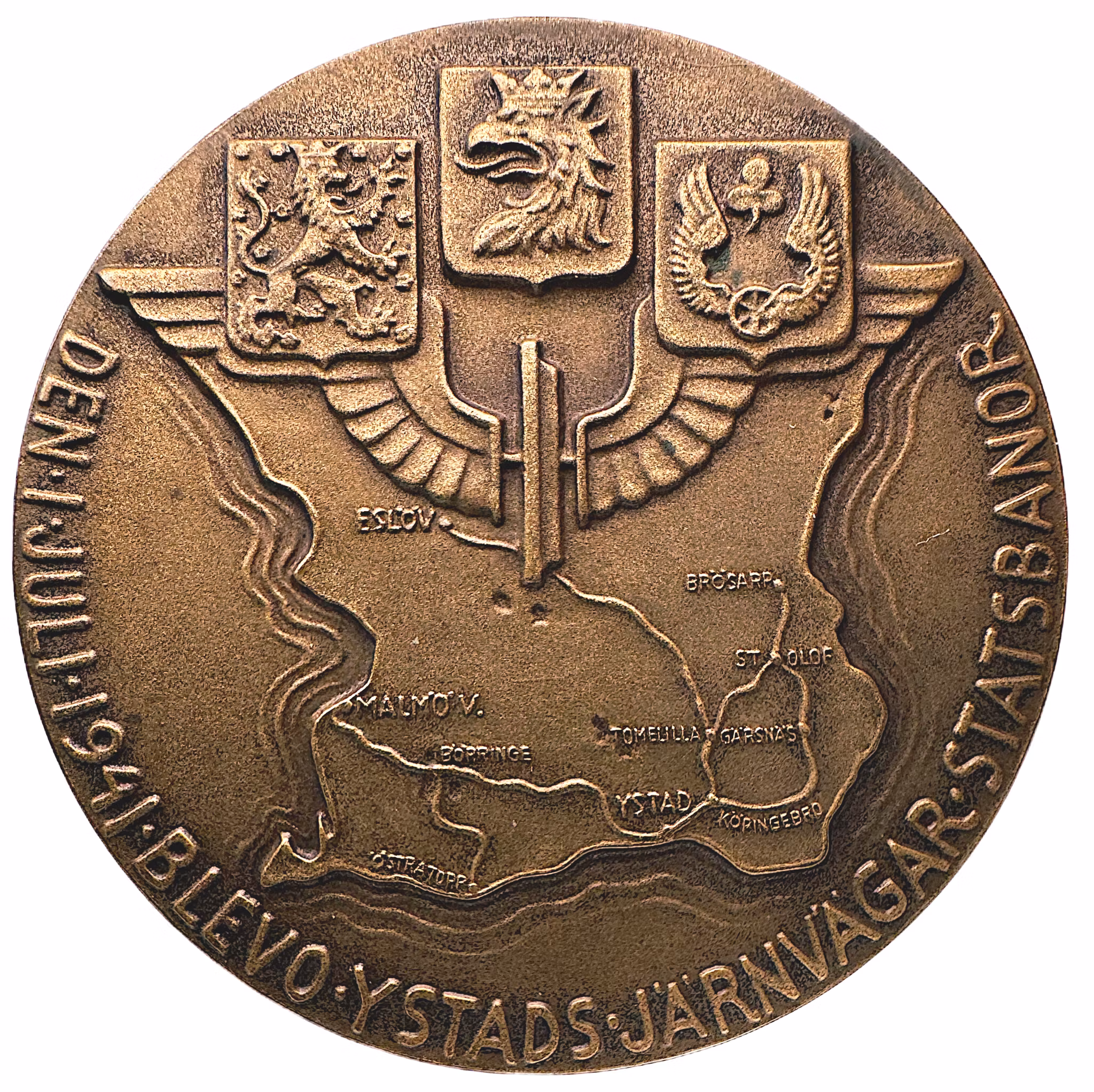 På medaljens åtsida löper texten "DEN 1 JULI 1941 BLEVO YSTADS JÄRNVÄGAR STATSBANOR" längs kanten. Denna text anger datumet och anledningen till medaljen: förstatligandet av Ystads Järnvägar. Det centrala motivet är en reliefkarta över södra Skåne som visar sträckningen för de berörda järnvägarna. På kartan finns orter som ESLÖV, MALMÖ, BORRINGE, ÖSTRATORP, YSTAD, KÖPINGEBRO, TOMELILLA, GÄRSNÄS, STOLOF och BRÖSARP utmärkta. Ovanför kartan syns tre heraldiska vapensköldar som vilar på ett bevingat hjul, en klassisk symbol för järnvägen. Vapensköldarna representerar (från vänster) Ystads kommun (ett krönt lejon), Malmö stad/Skåne (ett krönt griphuvud) och Eslövs stad (en krönt fågel).
