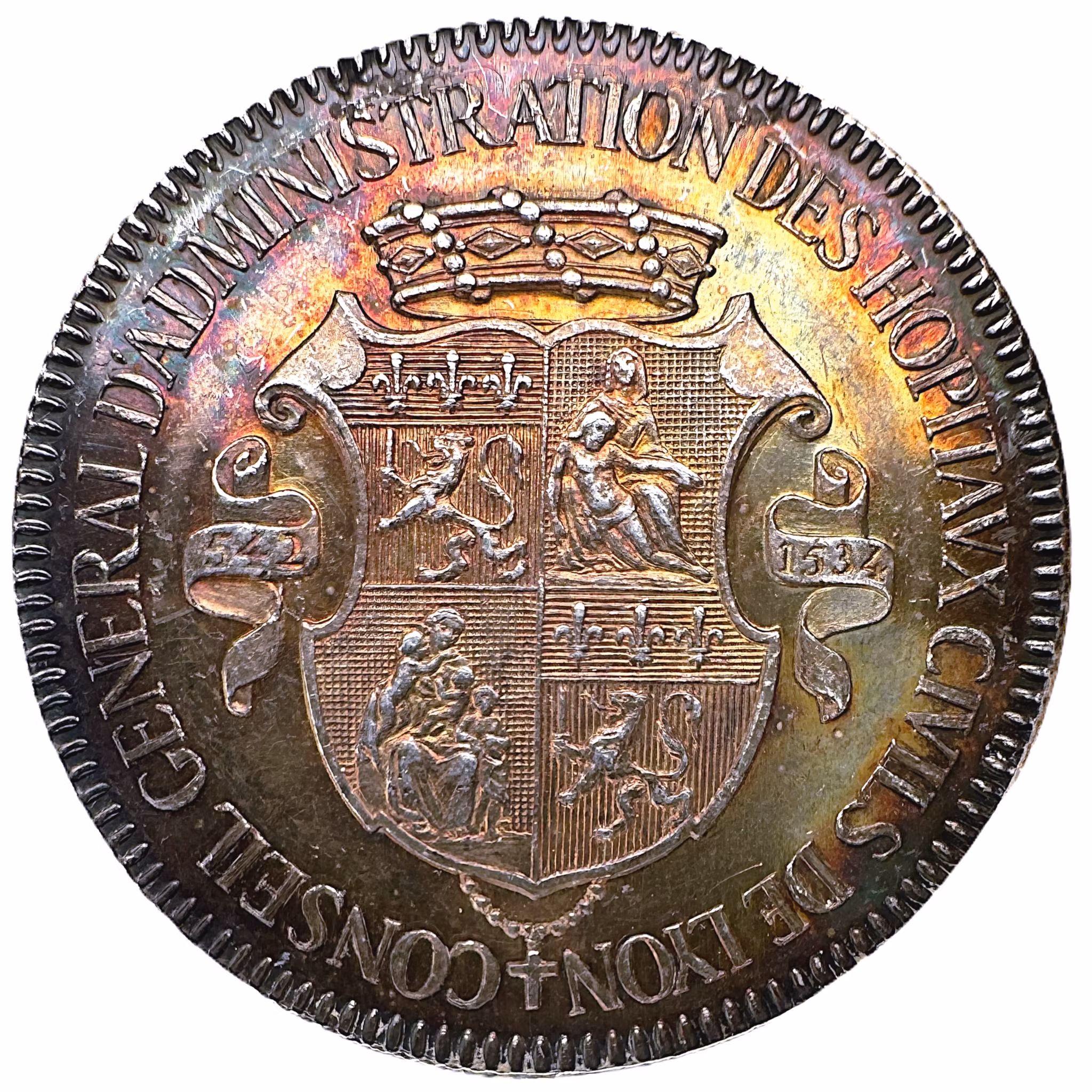 En fyrdelad, krönt vapensköld, flankerat av veckkade band med årtalen 542 till vänster och 1534 till höger. I omskriften: "CONSEIL GENERAL D'ADMINISTRATION DES HOPITAVX CIVILS DE LYON" (Generalförvaltningen för civila sjukhusen i Lyon)