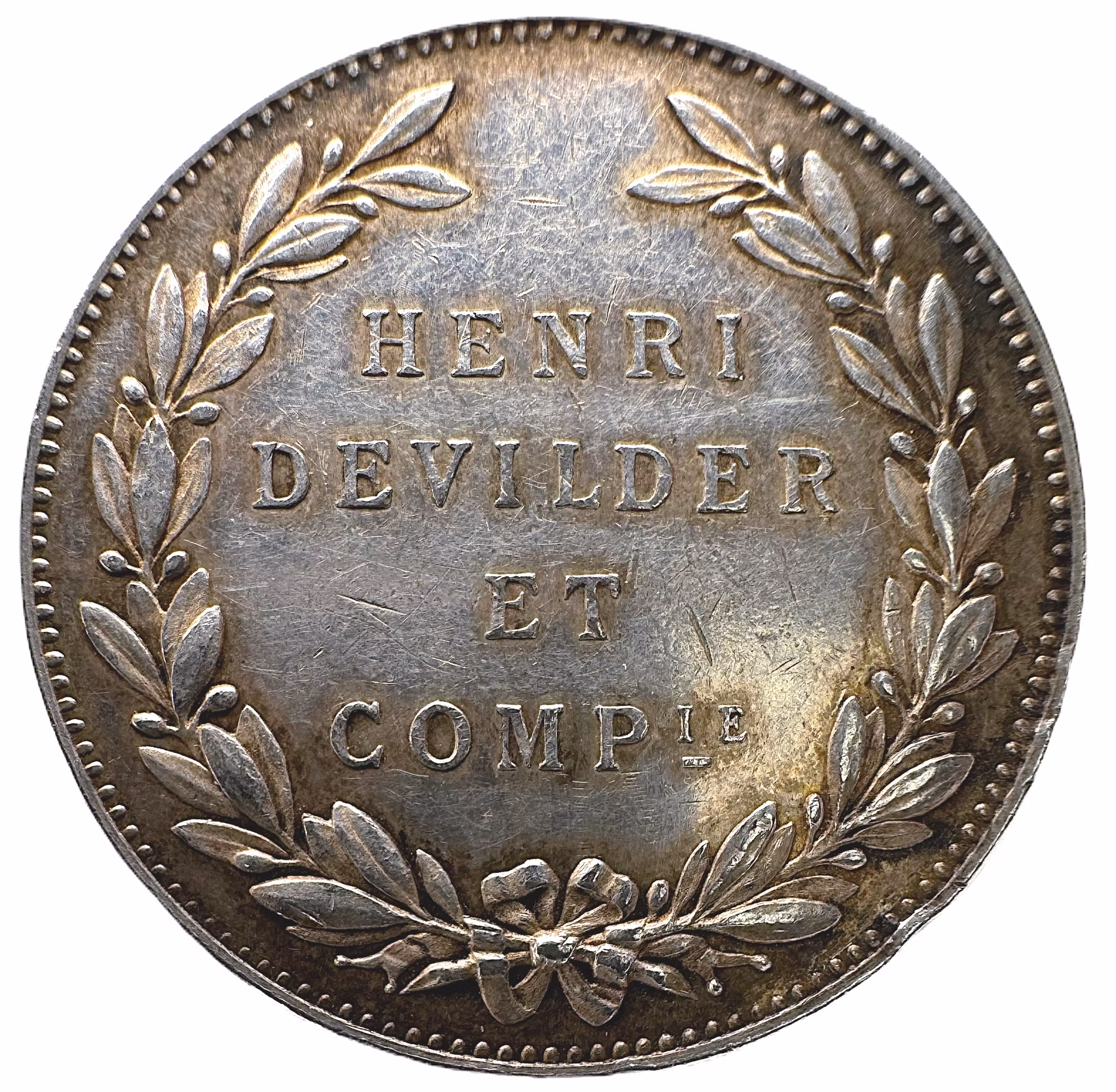 Silvermedalj, 28.79g, 38mm, kvalitet 1+. Av företaget Henri Devilder et Compagnie.