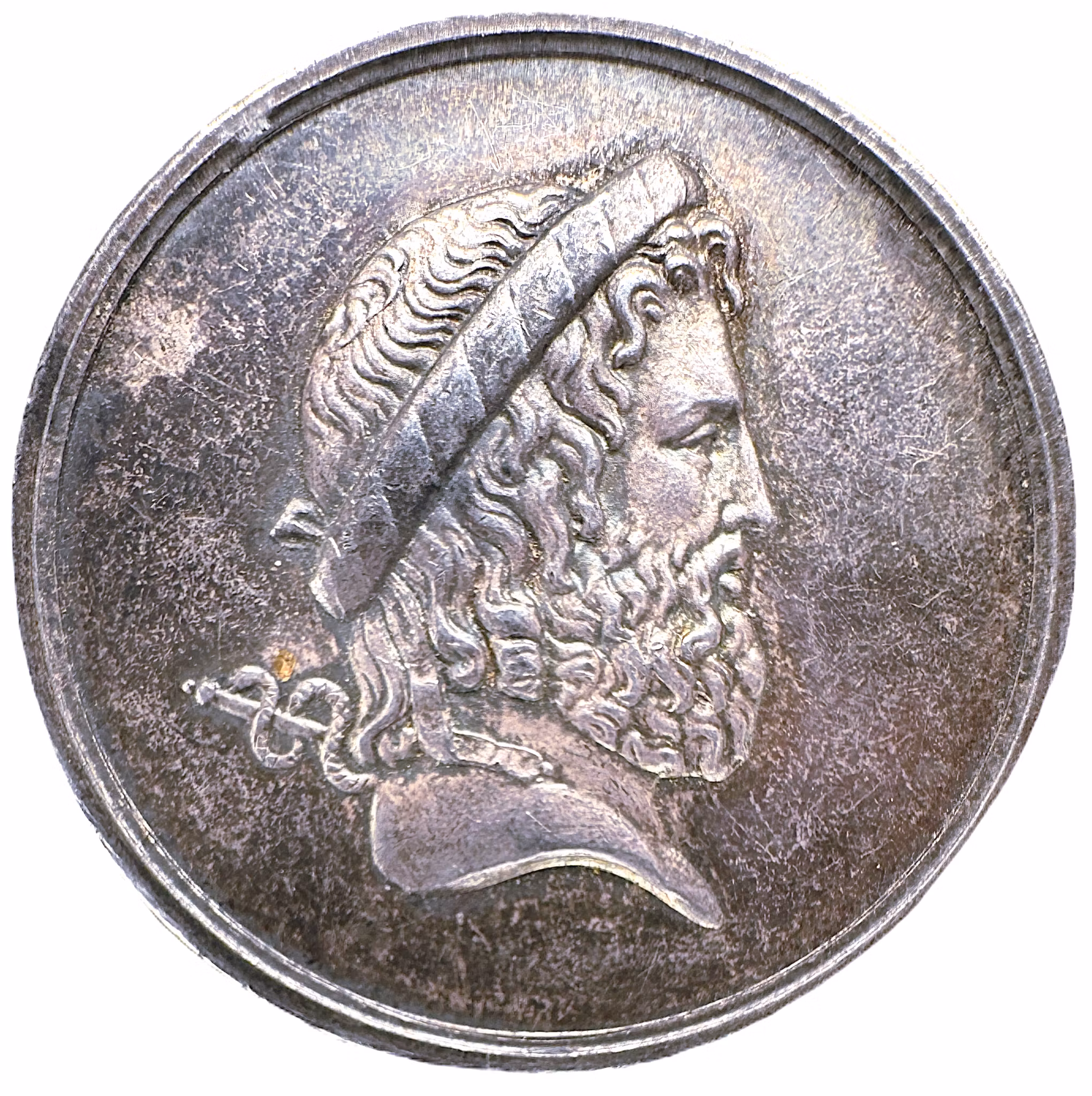 Denna medalj är ett praktfullt exempel på hur 1800-talets Frankrike hyllade sina medicinska institutioner genom att knyta an till antikens ideal. Porträttet av Hippokrates symboliserar inte bara medicinsk kunskap, utan också moralisk auktoritet, vetenskaplig rationalism och filantropisk omsorg. Att denna medalj bär texten Hospices Civils de Paris visar tydligt att den antingen utdelats inom, eller präglats till stöd för, stadens sjukvårdssystem – ett område där antikens värden återupplivades för att legitimera samtidens humanitära insatser.