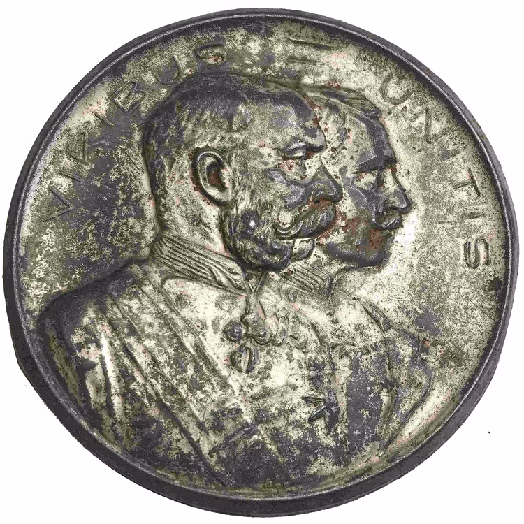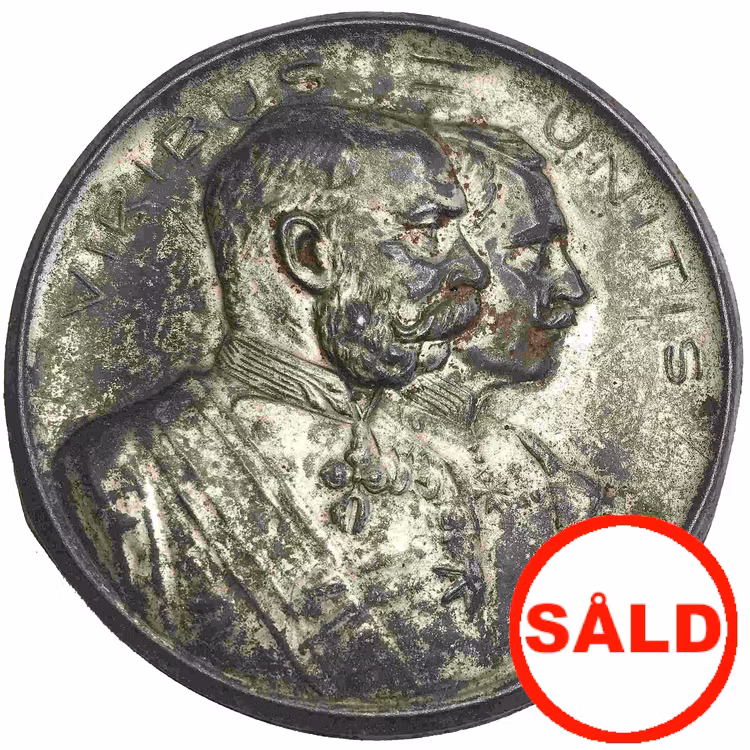 Ensidig brakteatprägling i Aluminium avbildandes Österrikes kejsare Franz Joseph tillsammans med den allierade Tyska Kejsaren Wilhelm II. För dig som samlar militaria från 1:a världskrigets är det ett tillfälle. Medaljen är troligtvis utgiven i samband med 1:a världskrigets utbrott 1914-15. Ett välbevarat exemplar utan skador. diameter 74mm.