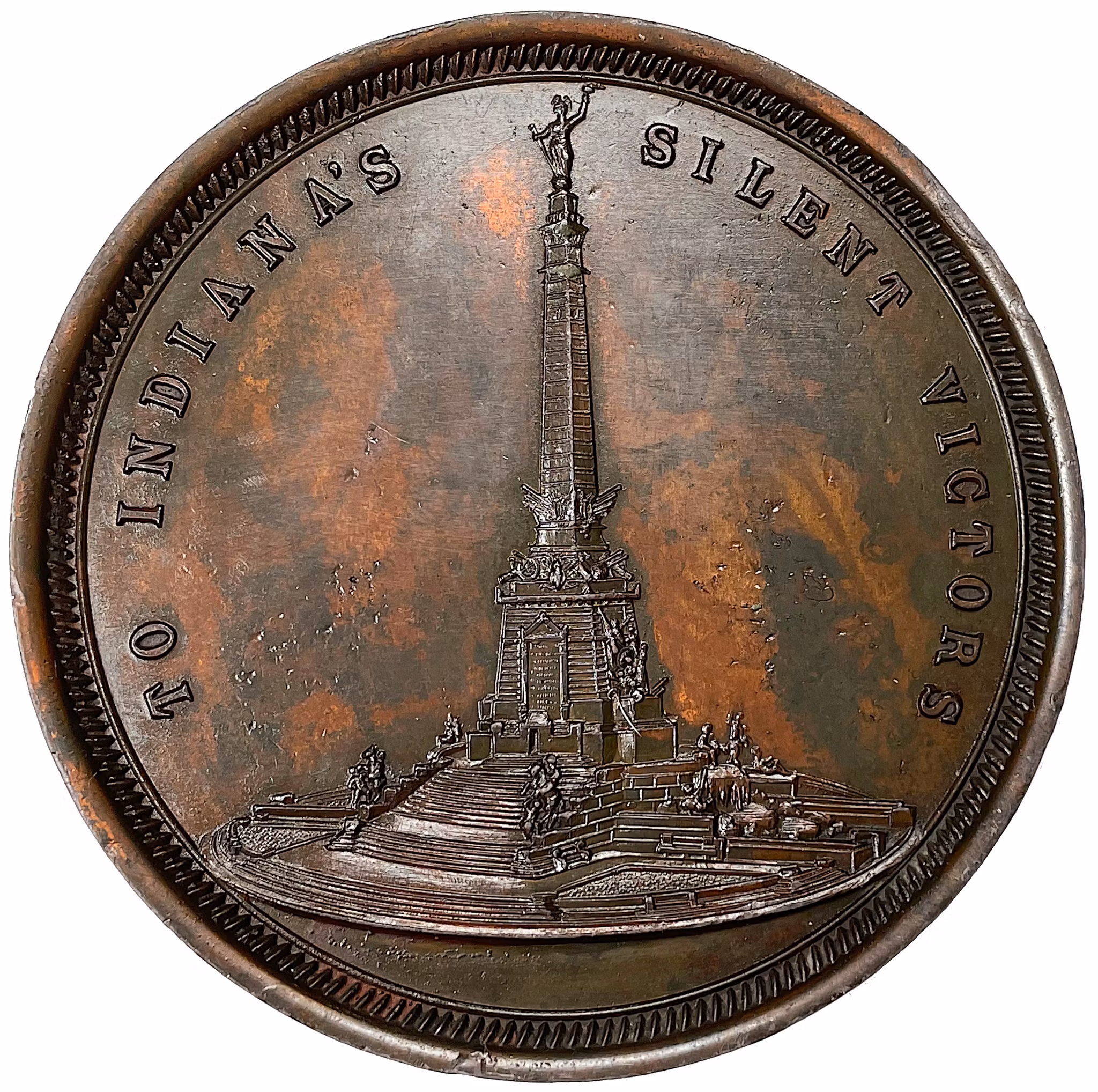 The medal is the war monument from Indiana, Indianapolis, in miniature and on its obverse is the monument depicted with the legend "TO INDIANAS SILENT VICTORS"