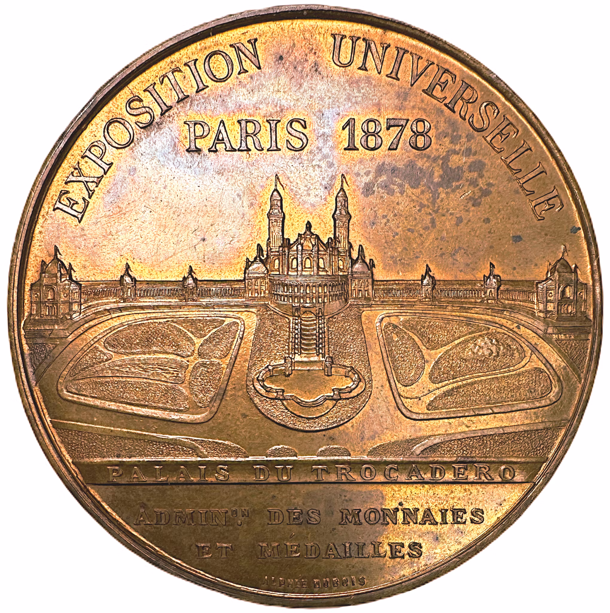 Avbildning av Palais du Trocadéro, med dess monumentala trappor och trädgårdar. Signerad: ALPHEE DUBOIS. Inskrift: "EXPOSITION UNIVERSELLE / PARIS 1878 // PALAIS DU TROCADERO / Admin.on des monnaies / et médailles"